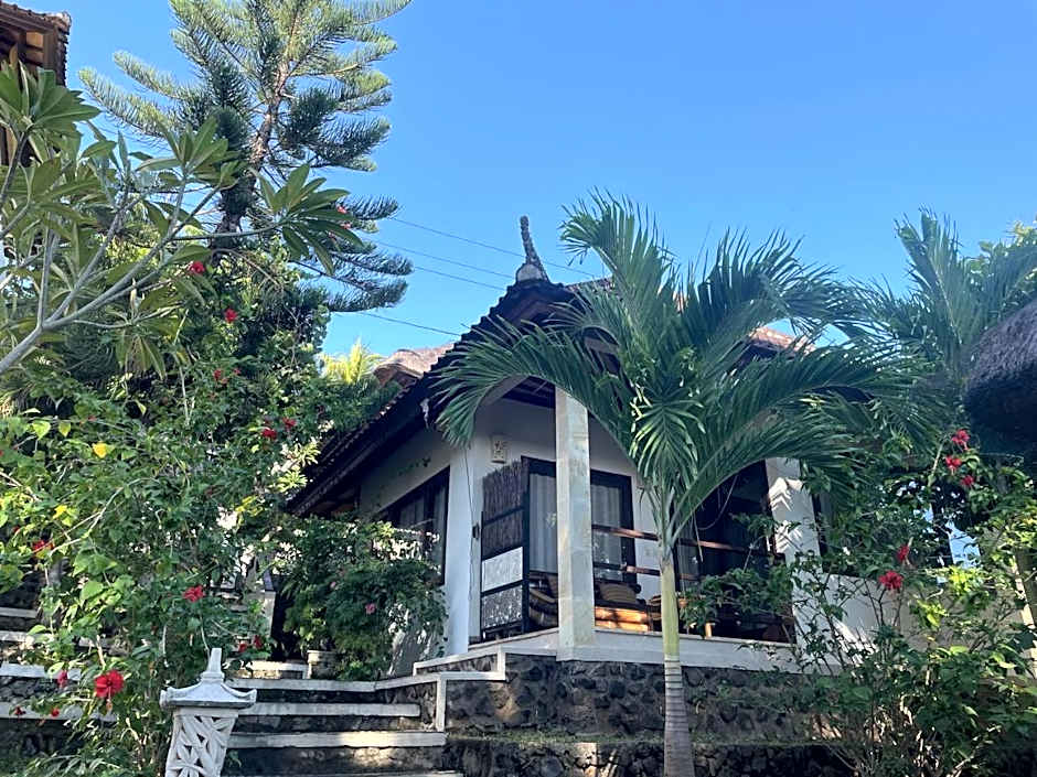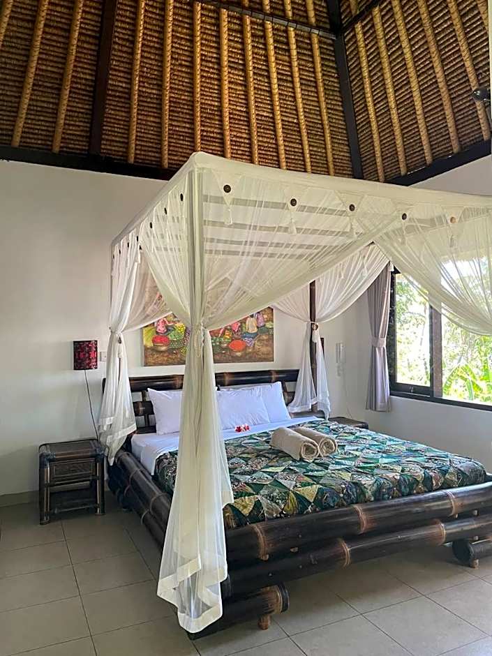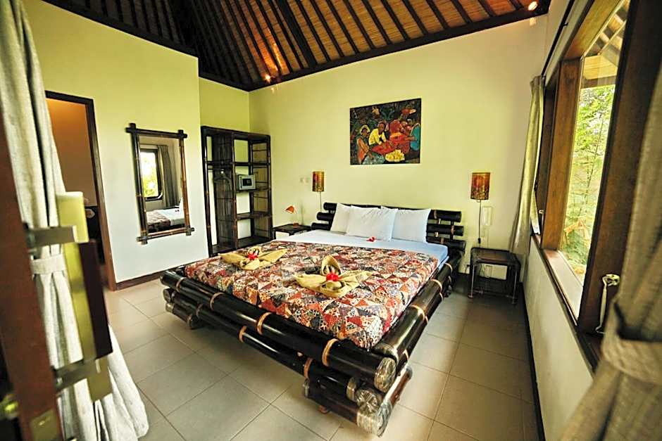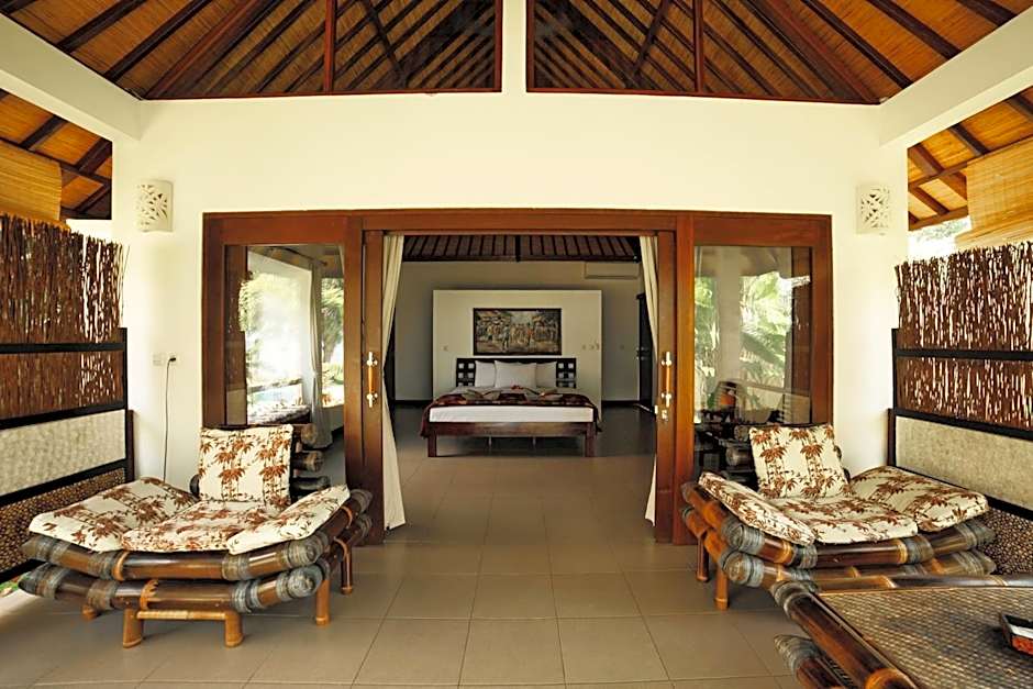 A spacious, air-conditioned villa with an private bathroom and views of the pool and ocean.